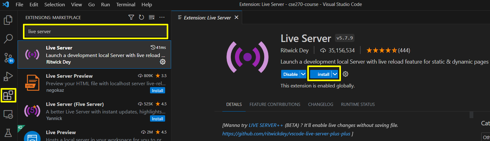 Once VS Code has been installed you must install the Live Server using the extensions installer.