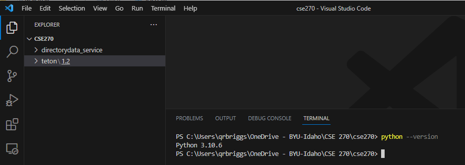 The version of python currently installed should print in the terminal window similar to below. If it does not, try re-installing python and make sure that the installer adds python to your PATH. If you are still having trouble, reach out to your instructor for help. Do not proceed to the next step until this is working .
