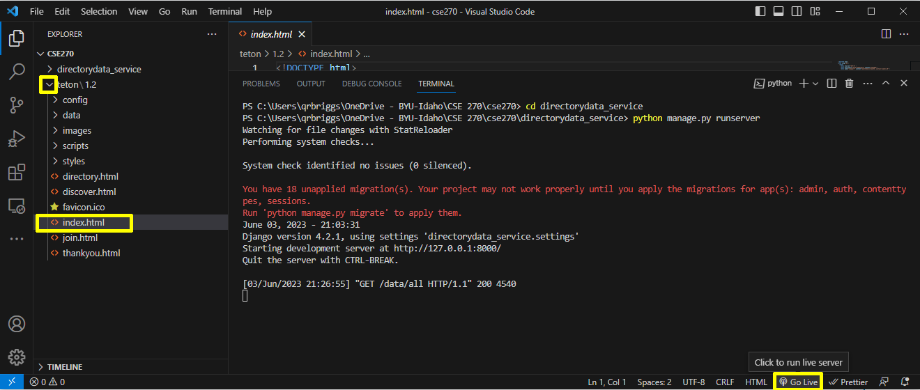 In VS Code, open the teton/1.2 folder and choose the index.html file.