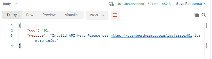 The services responded with an HTTP 401 Unauthorized response. In the body of the response was a JSON object with two items - cod and message. The message informs us that our API key was invalid. So much for testing with an empty appid!
