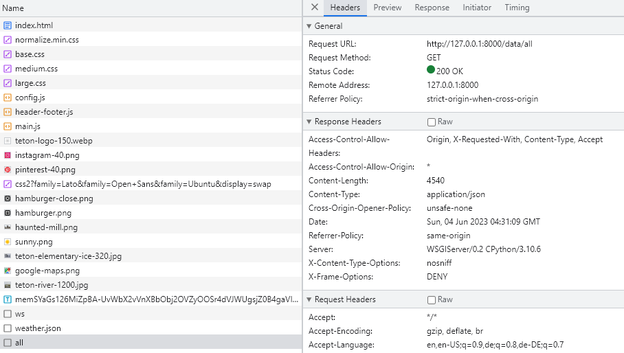 When you click on the "all" URL, this opens an information box to the right with several tabs. By default, the Headers tab is shown which displays useful information about the HTTP Request and HTTP Response. Again, explaining everything here is beyond the scope of this class, but it's helpful to know where this information is if a developer asks you for it. Notice the HTTP status code 200 OK appears here.
