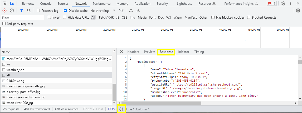 If we want to see the payload of the response from the server, we click on the "Response" tab. Sometimes the response comes back in a format that is not easily human-readable. Clicking the curly braces below { } can sometimes help by formatting the response. We can now inspect the response from the server to determine if everything looks as expected.