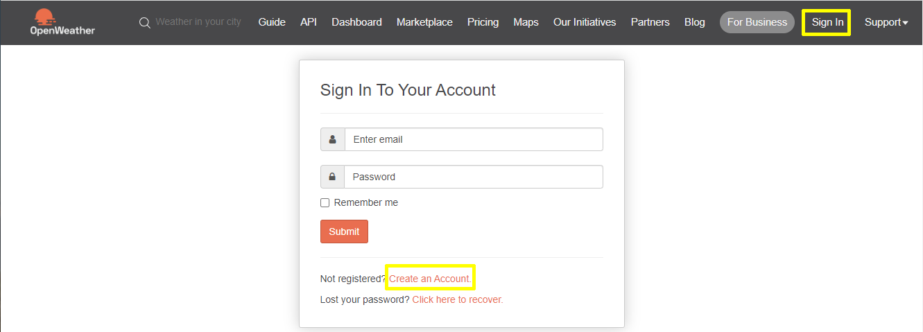 Browse to https://home.openweathermap.org/users/sign_in and click the "Create an account" button. Go through the registration process to create your free account.