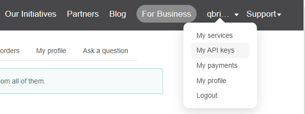 Once you are registered and logged in, click on your user name and choose "My API keys" from the menu.
