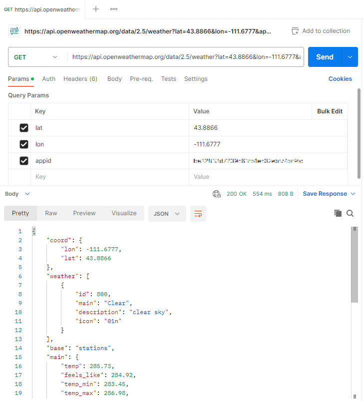 Copy this key and paste it into the appid value and press Send again. This time you will get a more complete response, including a JSON payload which you can inspect below. You can also see that the HTTP response code this time was 200 OK.