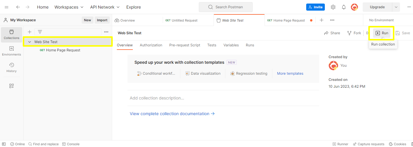 In Postman, highlight the Web Site Test collection you created, then click the Run button on the right hand side.