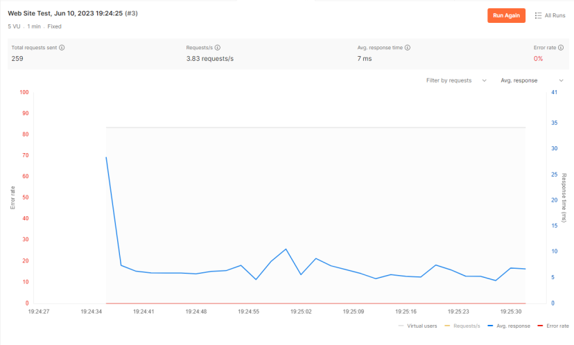 From this graph you can see that for this run, the average response time was 7ms with average of 3.83 request/s.