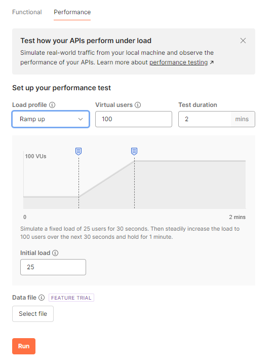This time, when we start the test we are going to use 100 virtual users (which is the limit Postman will allow). The