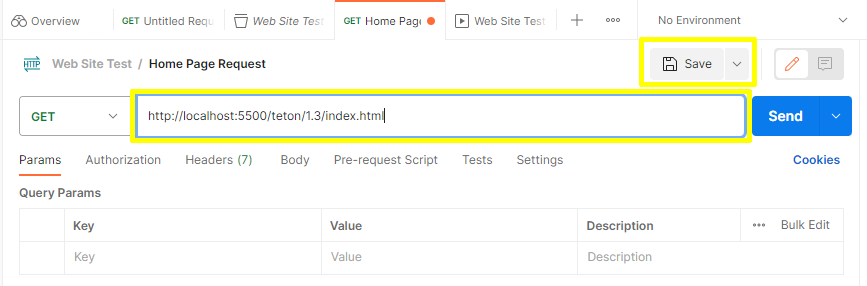 - Create the request as shown below by putting the URL http://localhost:5500/teton/1.3/index.html (or whatever URL is appropriate for your test site) in the request text box.